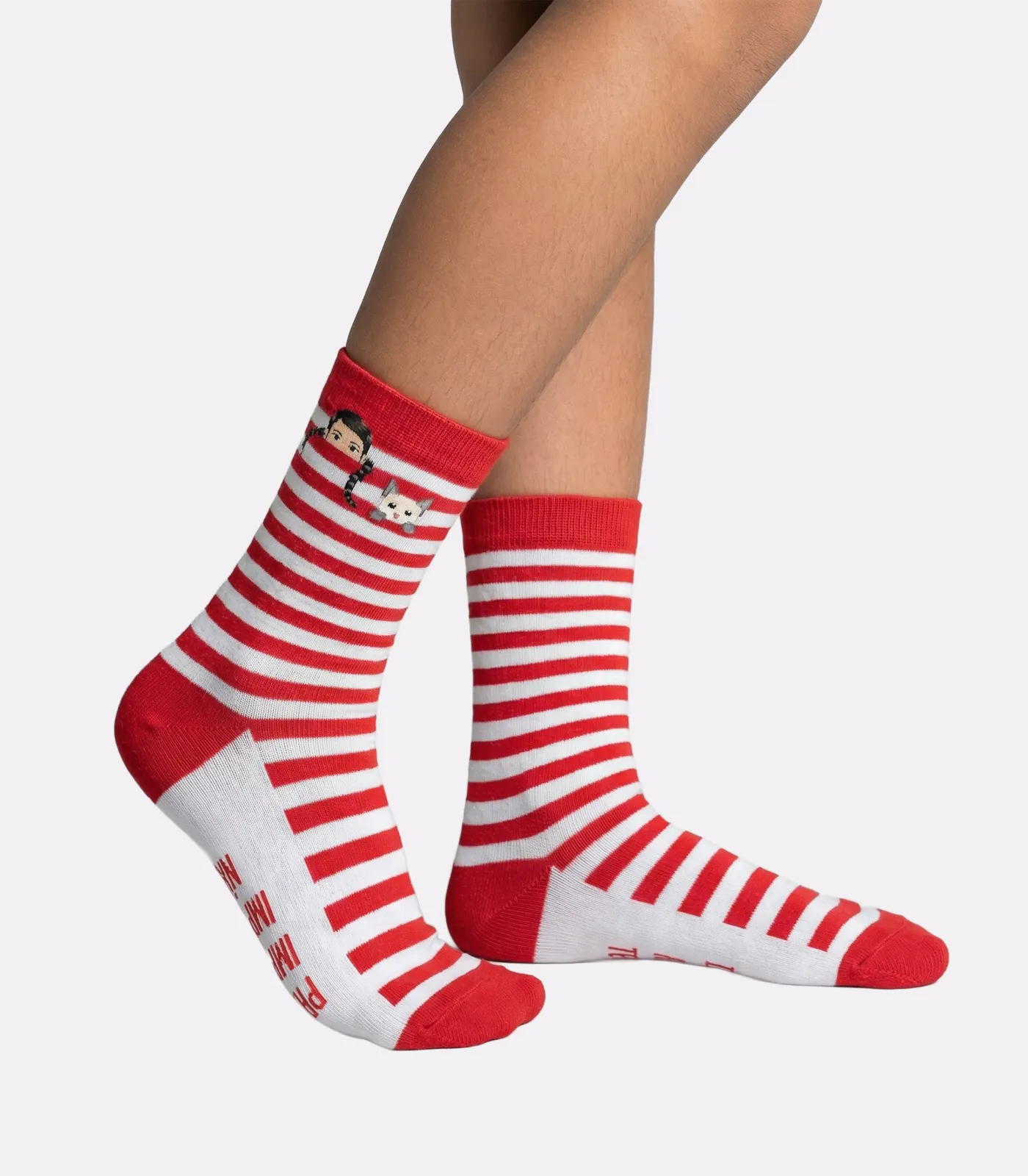 Meia longa branca com padrões listrados em vermelho. Tamanho único, de 30 a 43, malha 100% algodão.