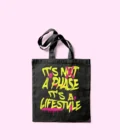 Tote bag na cor preta com alças pretas, confeccionada em 100% algodão para um acabamento resistente e sustentável. A estampa em serigrafia garante durabilidade e um visual autêntico.