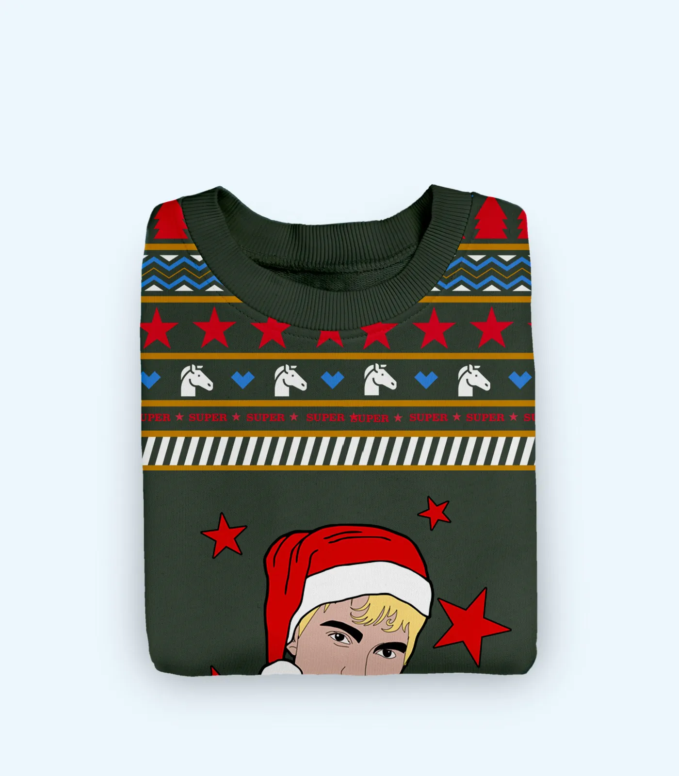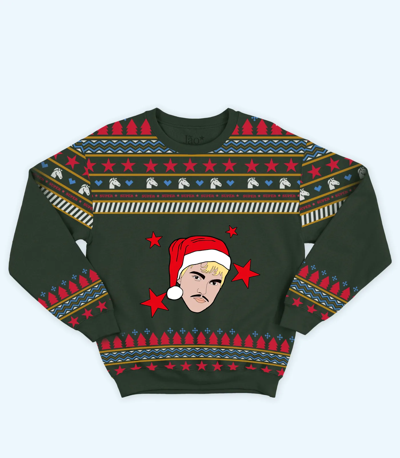 Blusa na cor verde com padrões natalinos, gola careca, malha 100% algodão. Produto tintura artesanalmente.